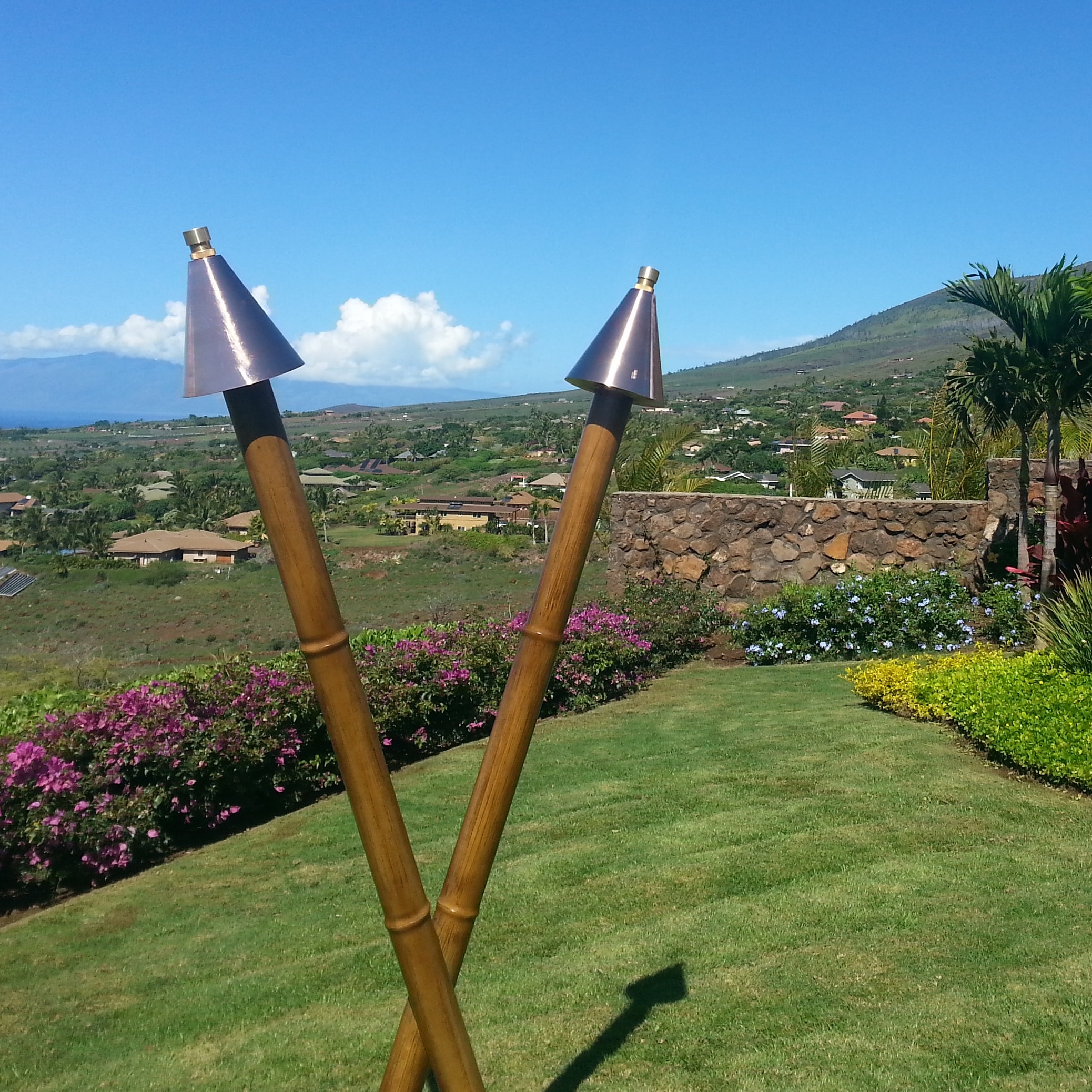 Bill, your “Island Style Bamboo” pipe covers for our tiki torches are “no ka oi” (the best). What a great idea! To be honest, while building our new home in Launiupoko we did not give much thought to the tiki torch covers. That changed when my wife and I noticed how fast our neighbor’s bamboo tiki torch covers had deteriorated in just over one year. We were both very impressed with your brilliant solution to this problem and felt very fortunate to be one of your first customers. They are perfect. It has been almost 2 years now and no guests have noticed that they are not real bamboo. Combining beauty while making it maintenance free is a winning formula and you nailed it!
